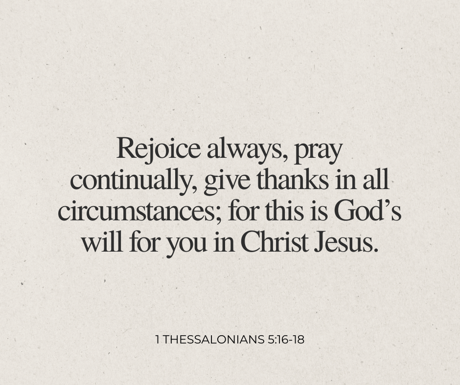 Joy, prayer, and gratitude are not duties to check off, but a way of living aligned with Christ, who embodied them perfectly. God’s will doesn’t weigh us down; it shapes our hearts to mirror His: joyful, prayerful, and thankful.